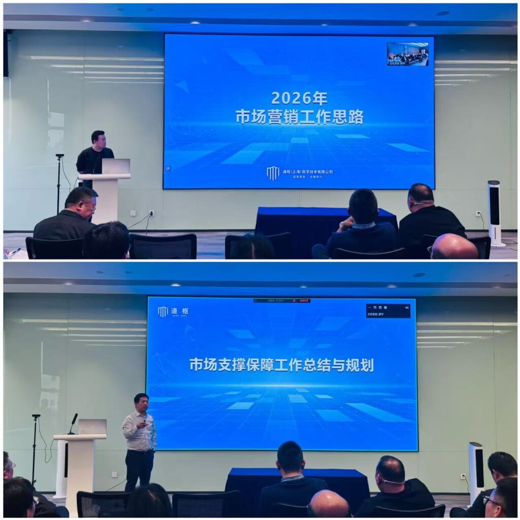 表彰过后,干货满满的工作分享与规划部署依次展开。副总经理任毅发表《市场营销工作思路》报告,全面复盘2025年道枢在市场拓展、品牌升级、产品研发、生态共建四大领域的亮眼成果;同时立足2026年行业发展新形势,深入拆解市场布局、业务打法与攻坚方向,为新一年市场营销工作锚定坐标、明确路径。随后,总经理那正平围绕“市场支撑保障工作总结与规划”发表讲话,他指出,2025年道枢在产品化迭代、产品矩阵扩容、交付效率提升上实现跨越式突破,交出了一份亮眼答卷。面向未来,公司将持续聚焦研发创新、优化交付体系、完善激励机制,筑牢市场支撑“硬根基”,让每一位奋斗者都能在道枢的平台上收获成长、实现价值、感受温暖。
